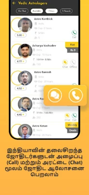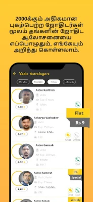 உங்கள் வாழ்வின் கேள்விகளுக்குத் தெளிவு பெற, ஆஸ்ட்ரோயோகி 2000-க்கும் மேற்பட்ட இந்தியாவின் தலைசிறந்த ஜோதிடர்கள், டாரட் வல்லுநர்கள், எண் கணித நிபுணர்கள், கே.பி. ஜோதிடர்கள், நாடி ஜோதிடர்கள், பிரஷ்னா குண்டலி வல்லுநர்கள் மற்றும் வாஸ்து ஆலோசகர்கள் எனப் பரந்த நிபுணர் குழுவை ஒருங்கிணைக்கிறது. இந்த நிபுணர்களுடன் ஆன்லைனில் எந்நேரமும், எவ்விடமிருந்தும் இணைவதற்கான வாய்ப்பை ஆஸ்ட்ரோயோகி வழங்குகிறது. முதல் ஐந்து நிமிடங்களுக்கு இந்த நிபுணர்களுடன் இலவசமாக ஆலோசனை பெற்று, உங்கள் சந்தேகங்களைத் தெளிவுபடுத்திக் கொள்ளலாம். பாஸ் மூலம் உங்களுக்குப் பிடித்த ஜோதிடருடன் விரைந்து இணைதல் மற்றும் நீண்ட அமர்வுகளுக்கான முன்பதிவு போன்ற தனித்துவமான அம்சங்கள் உங்கள் அனுபவத்தை மேம்படுத்துகின்றன. உங்கள் தனியுரிமை 100% உறுதி செய்யப்படுகிறது, மேலும் 85-க்கும் மேற்பட்ட நாடுகளில் ஆஸ்ட்ரோயோகியின் சேவைகள் பயன்படுத்தப்படுகின்றன.