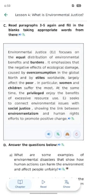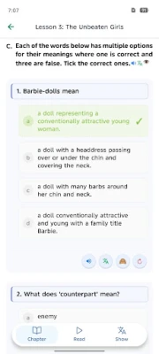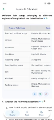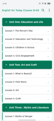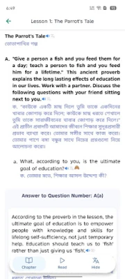 ஒவ்வொரு அத்தியாயத்தையும் முழுமையாகப் புரிந்துகொள்ள, பாடத்திட்டத்தில் உள்ள அனைத்து அலகுகளும் இதில் அடங்கும். சிக்கலான வாக்கியங்களையோ அல்லது புதிய வார்த்தைகளையோ கண்டால், ஒருமுறை தட்டினால் போதும், உடன் பெங்காலி மொழிபெயர்ப்பைக் காணலாம். தெளிவான உச்சரிப்பு வழிகாட்டிகளுடன், சொற்களை சரியாக உச்சரிக்க கற்றுக்கொள்ளலாம். மேலும், குரல் பதிவு செய்யப்படாமல், பயிற்சி செய்வதற்கான பேச்சுப் பயிற்சி வசதியும் உள்ளது, இது உங்களது பேசும்திறனை மேம்படுத்த உதவும். இணைய இணைப்பு இல்லாமலும், பதிவிறக்கம் செய்தவுடன் அனைத்து உள்ளடக்கத்தையும் பயன்படுத்தலாம். பார்வை சார்ந்த கற்றல் மேம்பாடுகளும் இதில் சேர்க்கப்பட்டுள்ளது, இது பாடங்களை மேலும் சுவாரஸ்யமாக்கும்.
