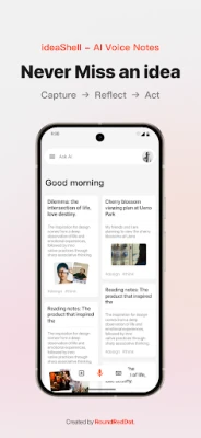 உங்கள் ஒவ்வொரு சிந்தனையையும் குரல் வழியாகவே பதிய உதவும், செயற்கை நுண்ணறிவுடன் இயங்கும் ஸ்மார்ட் குரல் குறிப்புகள் செயலி ideaShell. எந்த நேரத்திலும், எந்த இடத்திலும் உங்கள் எண்ணங்கள், யோசனைகள் அனைத்தையும் எளிதாகப் பதிவு செய்து, பாதுகாப்பாக சேமித்து வைத்துக்கொள்ளுங்கள்.