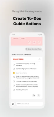 யோசனைகளின் உண்மையான மதிப்பு அவற்றை வெறும் குறிப்புகளாக வைத்திருப்பதில் இல்லை, மாறாக அவற்றிலிருந்து நீங்கள் பெறும் வளர்ச்சி மற்றும் அவற்றைச் செயலாக்குவதில் தான் உள்ளது. ideaShell-ன் ஸ்மார்ட் கார்டுகள், உங்கள் சிந்தனைகளைச் செயல் திட்டங்களாக மாற்றக்கூடிய "செய்ய வேண்டியவை" பட்டியலாக AI மூலம் உருவாக்கப்படுகின்றன. இவற்றை உங்கள் சிஸ்டம் நினைவூட்டிகள் அல்லது Things, Omnifocus போன்ற பிற பயன்பாடுகளில் எளிதாக இறக்குமதி செய்யலாம். ideaShell ஒரு தனிமைப்படுத்தப்பட்ட பயன்பாடு அல்ல; அது இணைப்புகளை விரும்புகிறது. நொஷன் (Notion), கிராஃப்ட் (Craft), வேர்ட் (Word), பியர் (Bear), யுலிசஸ் (Ulysses) போன்ற உங்களுக்குப் பிடித்த பல படைப்புக் கருவிகள் மற்றும் பணிப்பாய்ச்சல்களுடன் தடையின்றி ஒருங்கிணைந்து செயல்படுகிறது. இது உங்கள் குறிப்புகளையும், உருவாக்கப்பட்ட உள்ளடக்கத்தையும் எளிதாகப் பிற தளங்களுக்கு ஏற்றுமதி செய்ய உதவுகிறது. எந்தவொரு தலைப்பிலும் AI உடன் உரையாடலாம், புதிய குறிப்புகளையும் உருவாக்கலாம். உங்கள் பதிவு செய்யப்பட்ட குறிப்புகள் அனைத்தையும் AI நினைவில் வைத்திருப்பதால், இயல்பான மொழியில் அவற்றை நீங்கள் தேடலாம்.