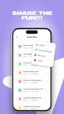 இந்த ஆற்றல்மிக்க கருவி, உங்கள் மைக்ரோஃபோன் வழியாக உடனடியாகப் பதிவுசெய்யும் வசதியை அளிக்கிறது. ஒரே ஒரு பொத்தானை அழுத்துவதன் மூலம், உங்கள் பதிவை இயல்பாகவோ அல்லது தலைகீழாகவோ இயக்கலாம். வெளிப்புற ஆடியோ கோப்புகளையும் எளிதாக உள்ளீடு செய்ய முடியும். உங்கள் சாதனத்தில் உள்ள கோப்புகள் அல்லது பிற பயன்பாடுகளிலிருந்து (பகிர்வு செயல்பாடு வழியாக) WAV, MP3, MP4, M4A, AIFC, AIFF, CAF, FLAC போன்ற பல்வேறு வடிவங்களில் ஒலிகளை இறக்குமதி செய்து, உங்கள் படைப்பாற்றலை அடுத்த கட்டத்திற்கு எடுத்துச் செல்லுங்கள்.